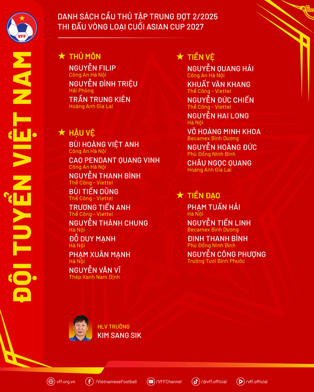 Một gương mặt thu hút nhiều sự quan tâm khác trong danh sách được triệu tập là Nguyễn Công Phượng. Tiền đạo kỳ cựu này lần gần nhất góp mặt ở trận giao hữu với Palestine hồi tháng 9/2023. Công Phượng đang thể hiện phong độ tốt khi dẫn đầu danh sách ghi bàn tại giải hạng Nhất quốc gia 2024/25 với 7 bàn thắng cho CLB Trường Tươi Bình Phước. Ở vị trí trấn giữ khung thành, Nguyễn Filip trở lại sau thời gian vắng mặt ở đợt hội quân gần đây nhất vì lý do gia đình.