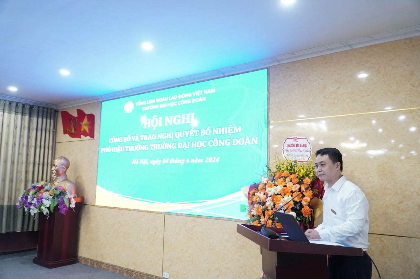 Được sự ủy quyền của Ban Lãnh đạo Nhà trường, TS. Nguyễn Thị Huyền-Phó trưởng Phòng Tổ chức công bố Nghị quyết bổ nhiệm chức danh Phó Hiệu trưởng đối với PGS.TS. Nguyễn Hiệp Thương, Phó trưởng Ban Tổ chức Tổng LĐLĐVN giữ chức Phó Hiệu trưởng Trường Đại học Công đoàn.