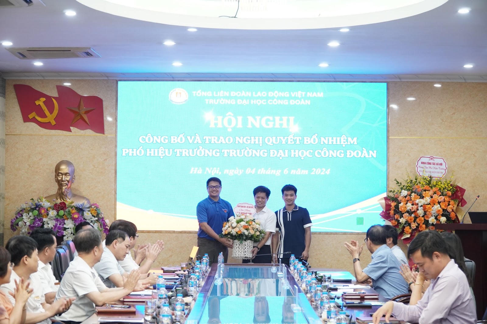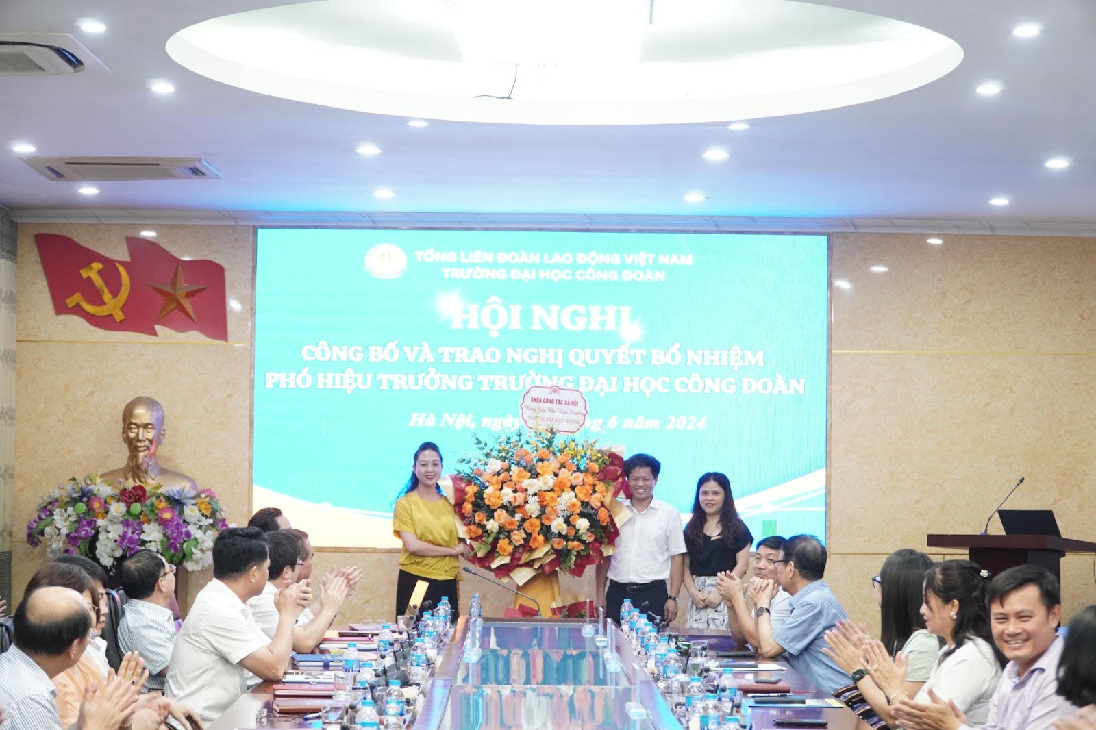 Đại diện Ban Tổ chức Tổng LĐLĐVN tặng hoa chúc mừng tân Phó Hiệu trưởng