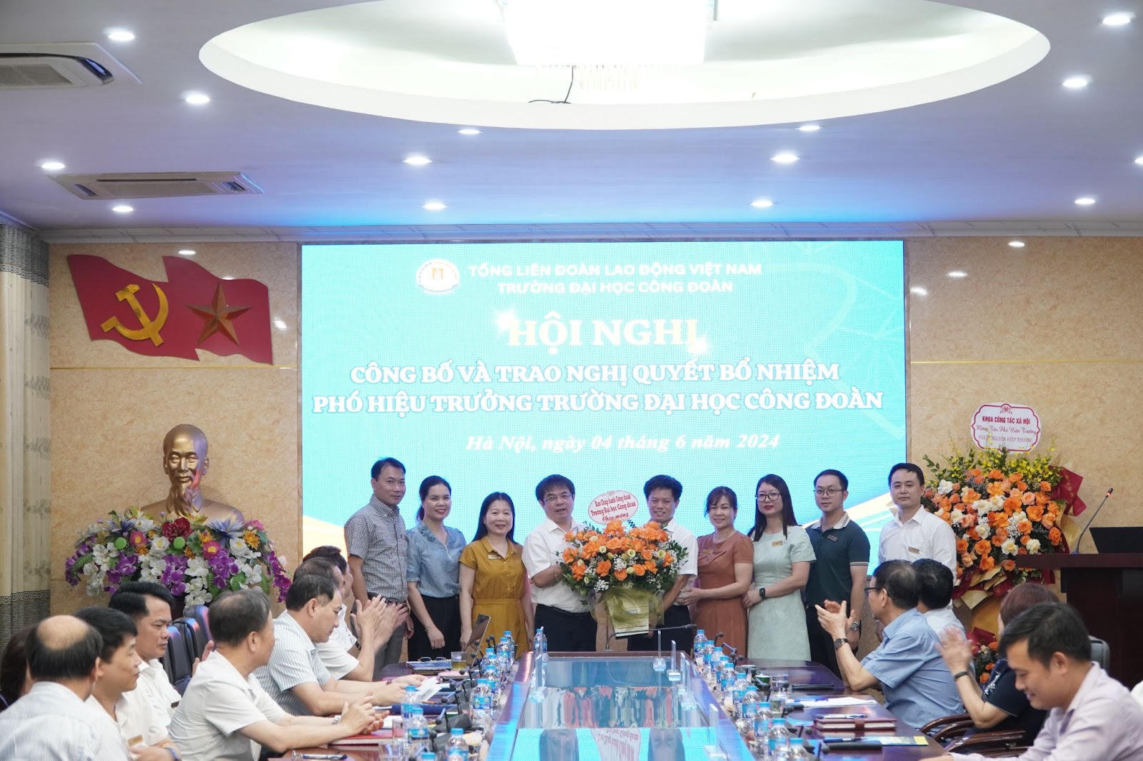 PGS.TS. Nguyễn Hiệp Thương (đứng bên phải) đón nhận Nghị quyết bổ nhiệm chức danh Phó Hiệu trưởng Trường Đại học Công đoàn