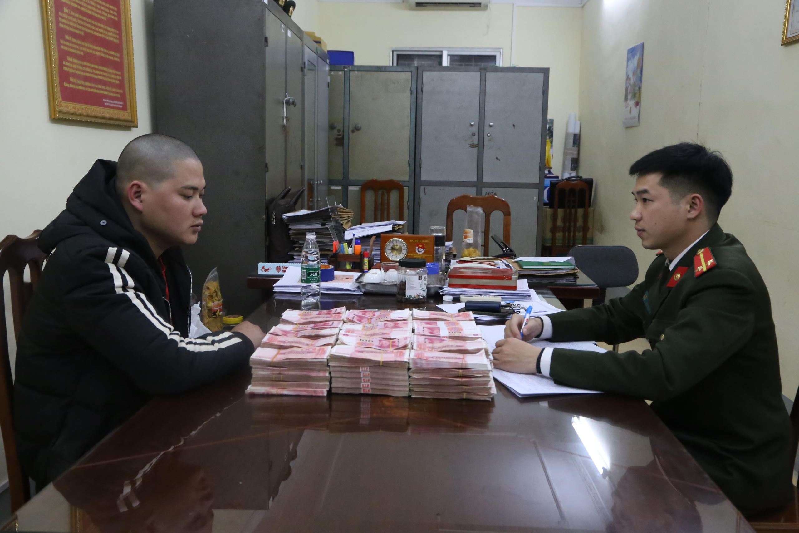Lấy lời khai một đối tượng trong đường dây vận chuyển tiền tệ qua biên giới vừa bị Công an Lạng Sơn triệt phá.