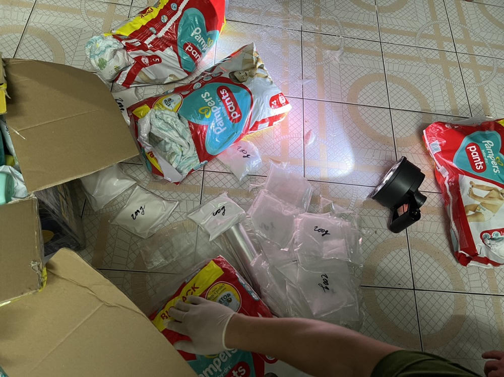 Lực lượng chức năng đã thu giữ khoảng 8kg chất bột màu trắng. Theo khai nhận của đối tượng, đây là ma túy tổng hợp loại ketamin, được Trang cất giấu, ngụy trang rất tinh vi trong các bỉm quần của trẻ em và dự định sẽ tiếp tục vận chuyển số ma túy này đưa đi tiêu thụ.
