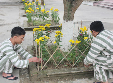 | Các phạm nhân chăm sóc những luống hoa trong trại giam |