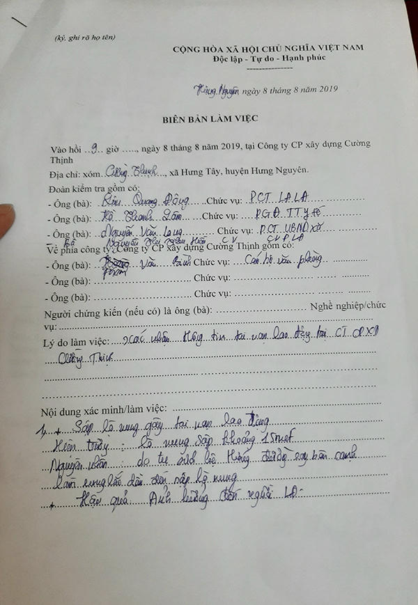 Theo biên bản làm việc giữa tổ công tác gồm Phòng Lao động thương binh và xã hội, Trung tâm Y tế huyện, UBND xã Hưng Tây với đại diện Công ty Cường Thịnh vào sáng 8/8 có nêu: Hiện trường: Lò nung sập khoảng 15m, nguyên nhân do tu sửa hệ thống đường ray bên cạnh làm rung lắc dẫn đến sập lò nung; Hậu quả ảnh hưởng đến người lao động.