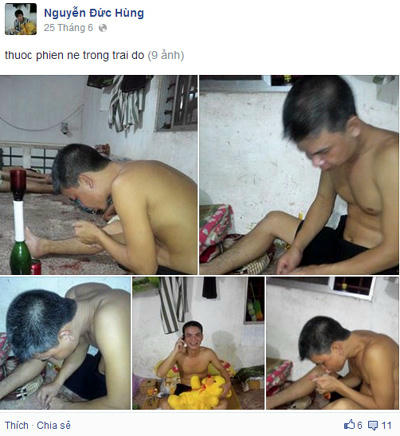 Trong các hình ảnh được chia sẻ còn xuất hiện những chiếc điện thoại di động. Thậm chí, một hình ảnh gây sốc là ảnh một thanh niên có biểu hiện như đang sử dụng ma túy tổng hợp. Một chiếc chai nhựa được “chế” trông như đồ để sử dụng ma túy tổng hợp dạng “đá”. “Thừa nhận” trên những hình ảnh này, chủ nhân facebook viết: “thuoc phien ne trong trai do” (tạm dịch: thuốc phiện nè trong trại đó - PV).