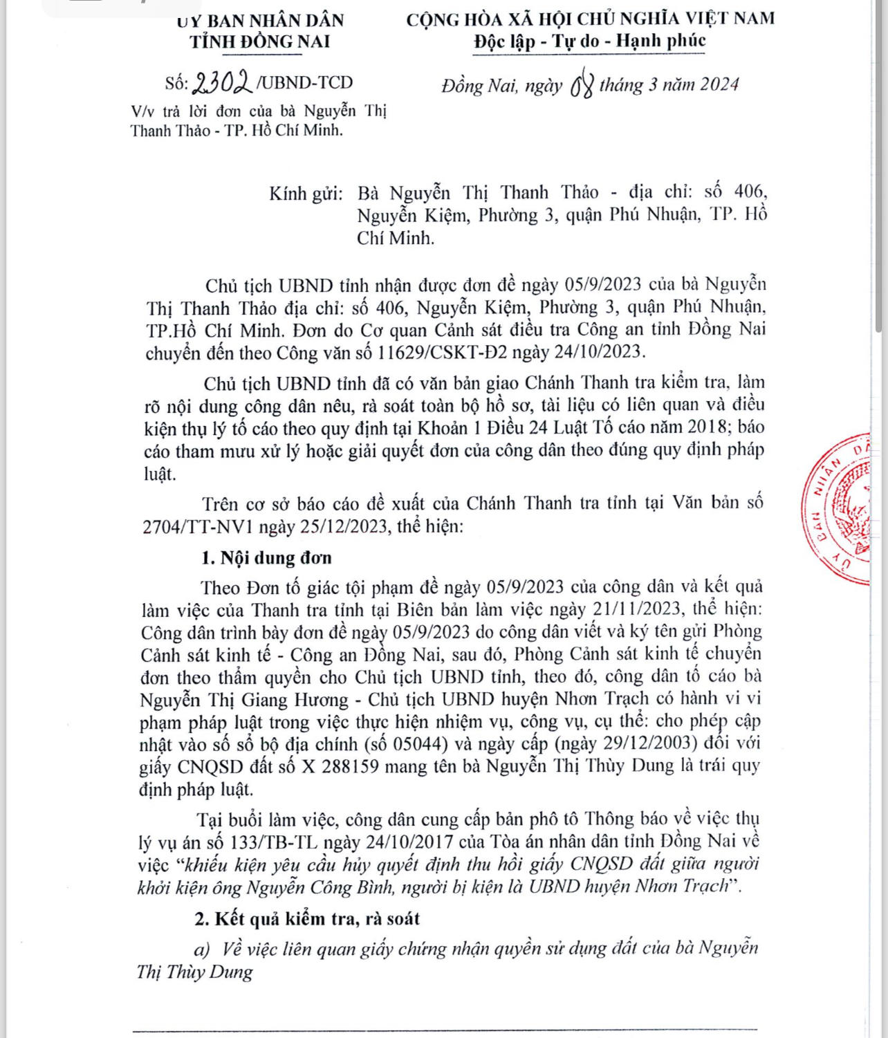 Theo đó, Chủ tịch UBND tỉnh Đồng Nai cho biết: “Việc công dân tố cáo bà Nguyễn Thị Giang Hương, Chủ tịch UBND huyện Nhơn Trạch có hành vi vi phạm pháp luật trong việc thực hiện nhiệm vụ, công vụ, cụ thể: Cho phép cập nhật vào sổ bộ địa chính (số 05044) và ngày cấp (ngày 29/12/2003) với Giấy chứng nhận quyền sử dụng đất (GCN) số X 288159 mang tên bà Nguyễn Thị Thùy Dung là không có cơ sở”.