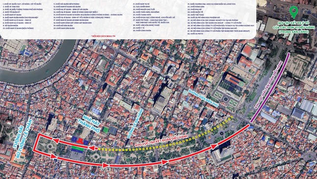 Sơ đồ di chuyển của các khối duyệt đội ngũ và diễu hành quần chúng. |