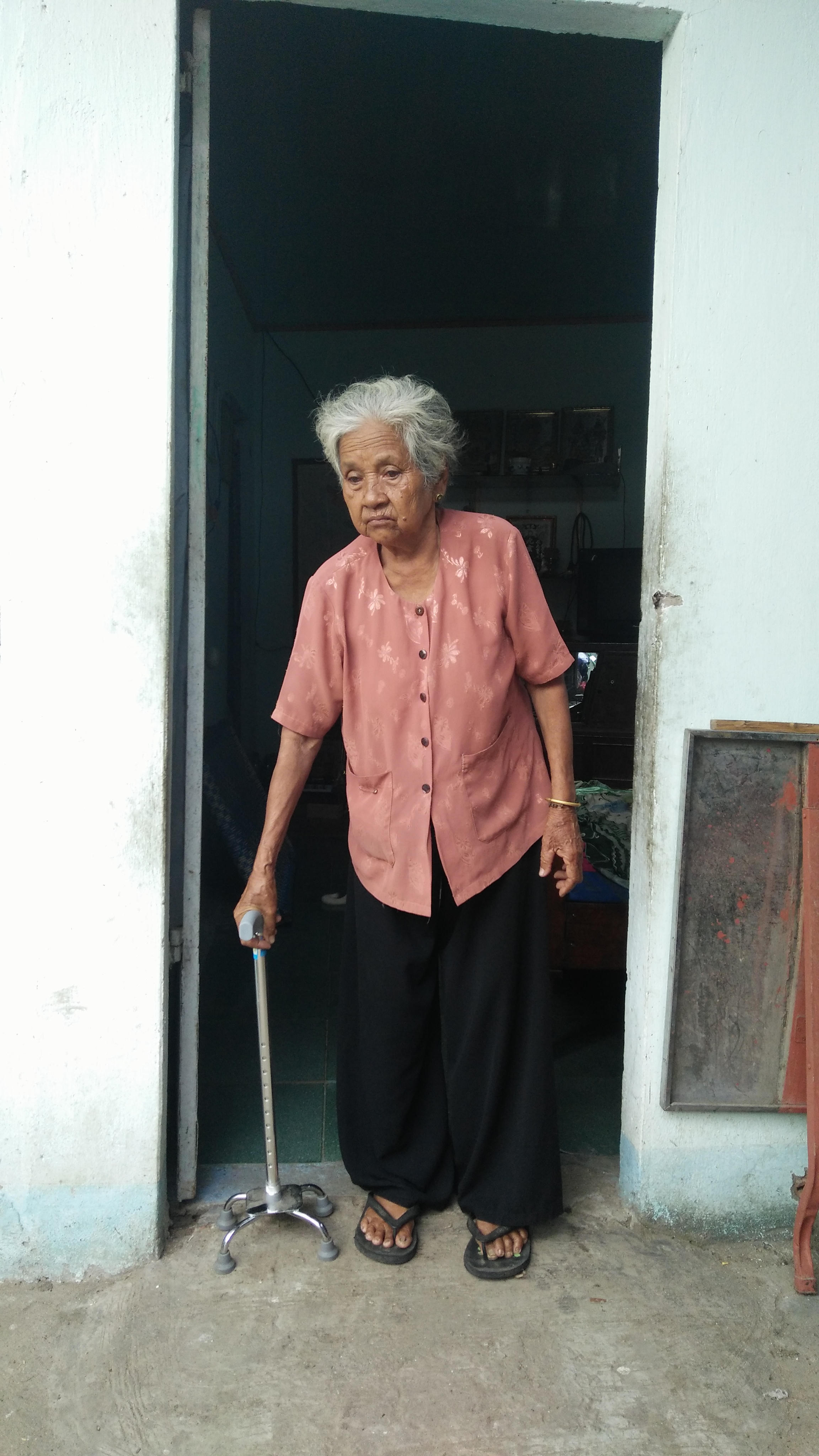Thấy khách, bà Cương chống gậy đi ra cửa, vẻ mặt phờ phạc buồn phiền: “Hôm trước, tôi vật lộn với nó can ngăn không cho nó chém ông ấy. Tôi van xin nhưng nó không chịu tha cho ổng. Nó nổi điên lên, đạp vào chân, rồi đánh vào tay, vào ngực, vào lưng khiến tôi ê ẩm, đau khắp người, đi lại khó khăn”.