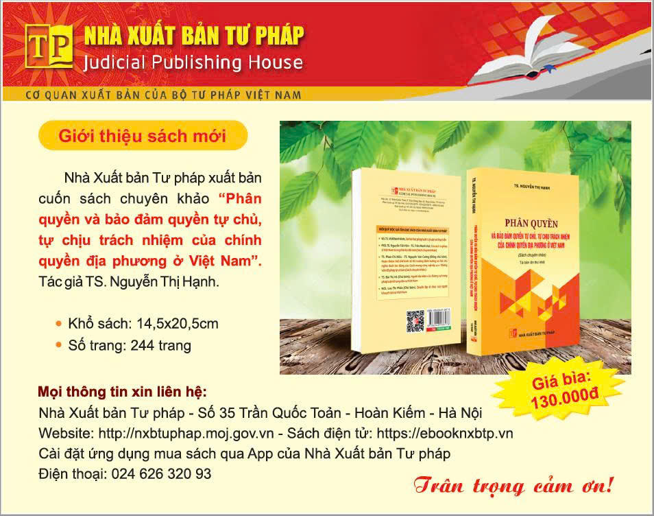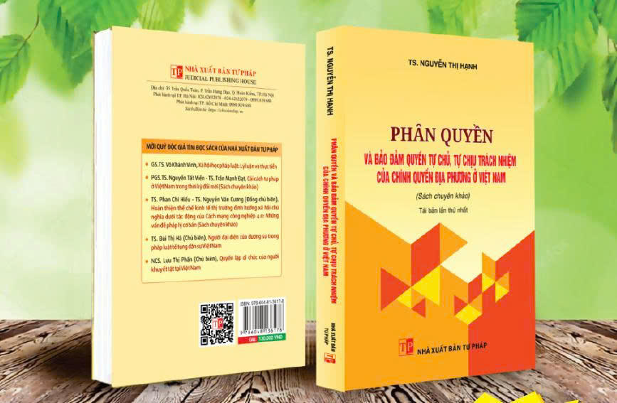 (PLVN) - Để đáp ứng yêu cầu tìm hiểu và nghiên cứu của bạn đọc, Nhà xuất bản Tư pháp xuất bản cuốn “Phân quyền và bảo đảm quyền tự chủ, tự chịu trách nhiệm của chính quyền địa phương ở Việt Nam” của TS. Nguyễn Thị Hạnh, Vụ trưởng Vụ Pháp luật hình sự - hành chính, Bộ Tư pháp.