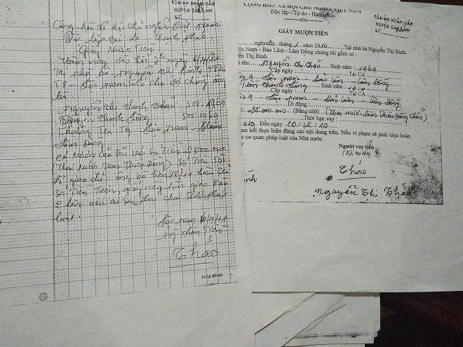 Giấy thứ hai viết tay ghi Nguyễn Thị Thanh Thảo và Nguyễn Thanh Long (chữ Nguyễn có chữ Trần viết đè lên) với số tiền 28 triệu đồng, thời hạn từ 6/4/2011 đến hết 6/8/2011. Đáng chú ý, lần cho vay thứ nhất đã quá hạn một năm nhưng bà Bình vẫn tiếp tục cho vay lần thứ hai.
