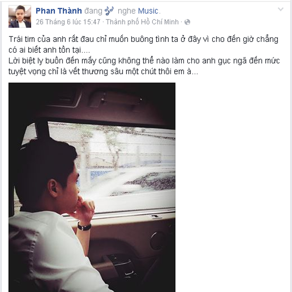 Hơn thế, những ngày trước Phan Thanh còn đau khổ tâm sự: "Trái tim của anh rất đau chỉ muốn buông tình ta ở đây vì cho đến giờ chẳng có ai biết anh tồn tại. Lời biệt ly buồn đến mấy cũng không thể nào làm cho anh gục ngã đến mức tuyệt vọng chỉ là vết thương sâu một chút thôi em à".
