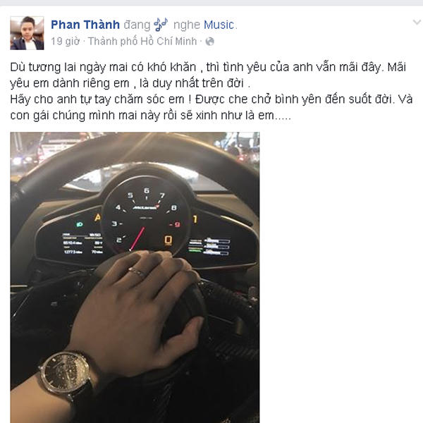 Những tưởng cả hai đã đường ai nấy đi và chẳng còn ai liên quan đến ai thì thời gian gần đây, đại gia trẻ tuổi Phan Thanh chia sẻ dòng tâm trạng. Ngày hôm qua anh viết trên trang cá nhân của mình: "Dù tương lai ngày mai có khó khăn, thì tình yêu của anh vẫn mãi đây. Mãi yêu em dành riêng em, là duy nhất trên đời. Hãy cho anh tự tay chăm sóc em ! Được che chở bình yên đến suốt đời. Và con gái chúng mình mai này rồi sẽ xinh như là em....."