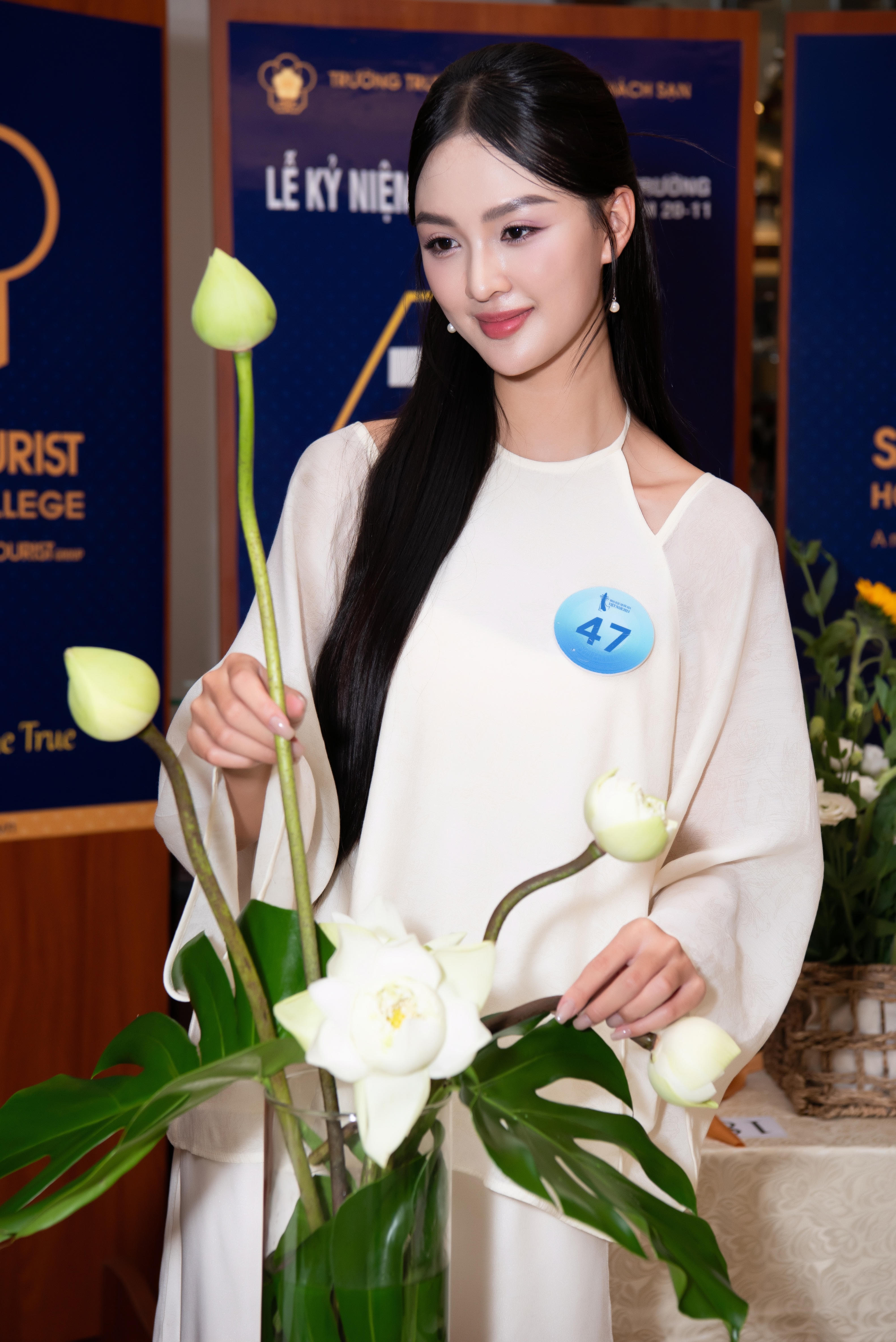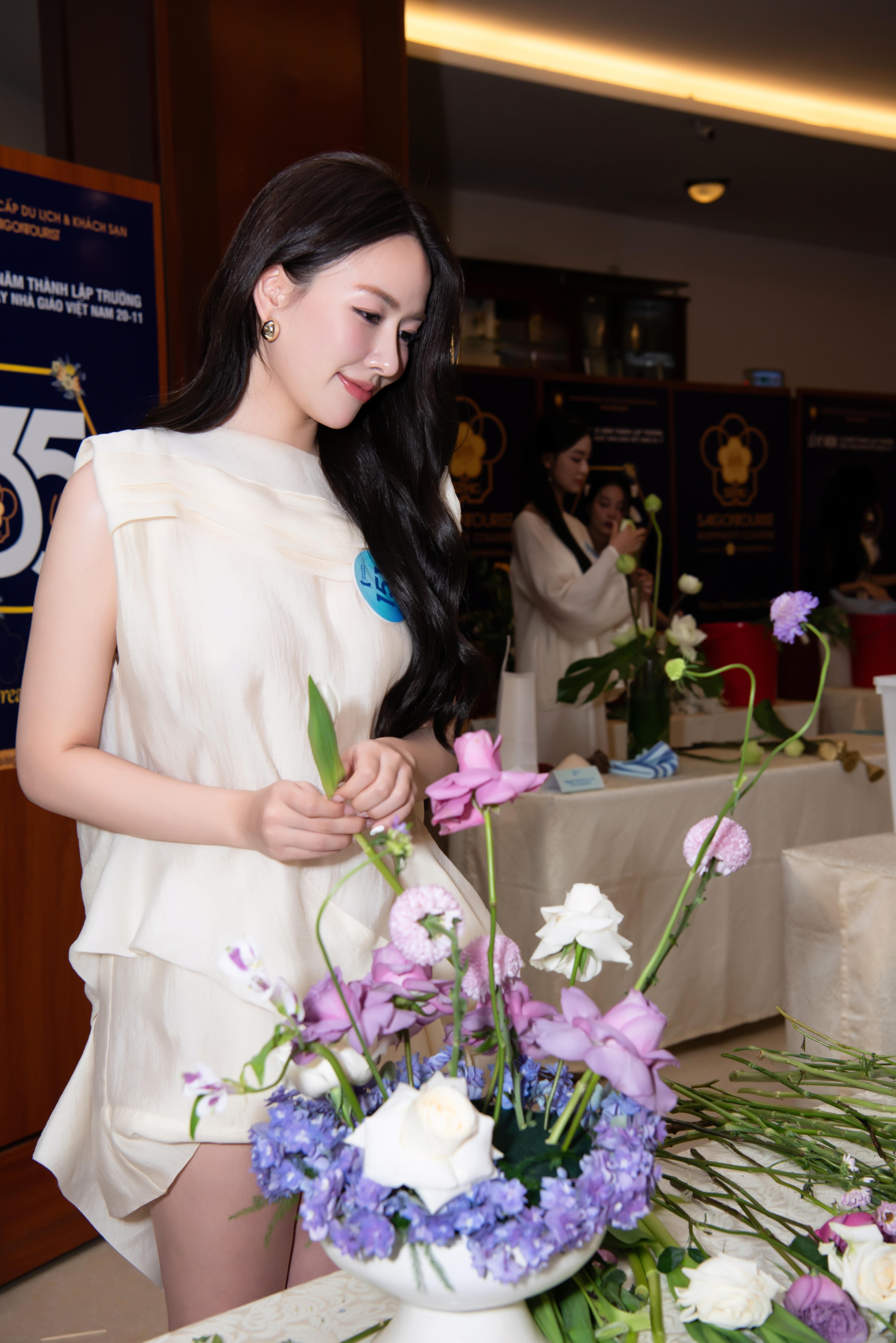 Trong phần cắm hoa nghệ thuật, thí sinh Đỗ Thái Khánh Vy (SBD: 59, TP HCM) chinh phục ban giám khảo với tác phẩm “Sen Việt”, kết hợp hài hòa giữa sen trắng, sen hồng và hoa ly trắng.