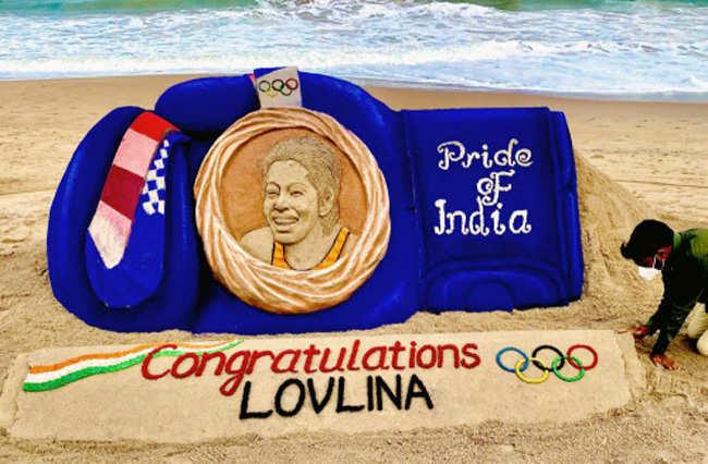 Một bức tranh cát đã được người hâm mộ tạo nên để chúc mừng thành tích của nữ võ sĩ Lovlina Borgohain. |