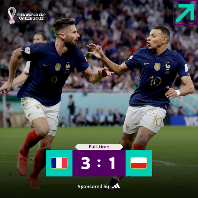 Tưởng chừng trận đấu sẽ kết thúc 2-0. Nhưng vẫn là Mbappe với một pha xứ lý ở cánh trái. Lần này Mbappe tung ra cú cứa lòng đẹp mắt đưa bóng vào góc xa khung thành Ba Lan ở phút 90+1, nâng tỷ số lên 3-0. Dấu chấm hết cho Ba Lan.
