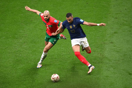 Mbappe có pha thoát xuống cực nhanh ở phút 51 nơi góc trái nhưng Amrabat đã kịp ngăn chặn.
