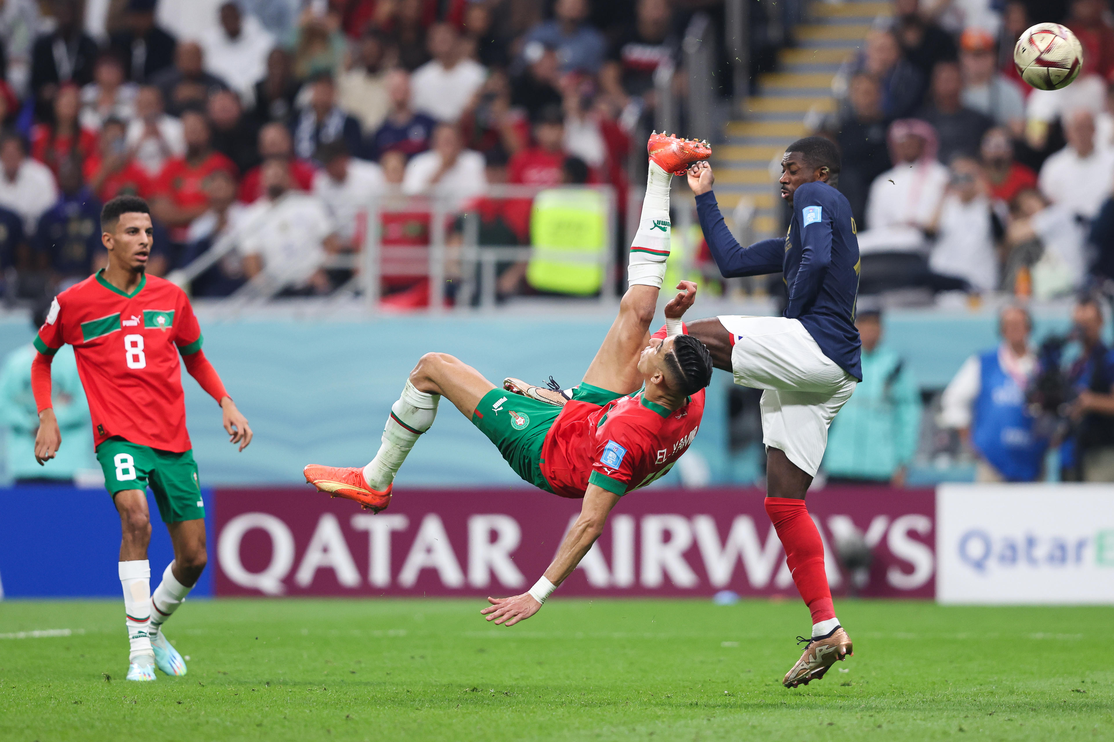 Hiệp 2 đang trôi về những phút cuối và Pháp đang tạm dẫn 2-0. Hiệp 2 được bù giờ 6 phút, nhưng đội tuyển Ma-rốc bất lực tìm kiếm bàn thắng. Trận đấu kết thúc với chiến thắng nghiêng về nhà đương kim vô địch với tỷ số 2-0. Ma-rốc sẽ tranh huy chương đồng với Croatia.