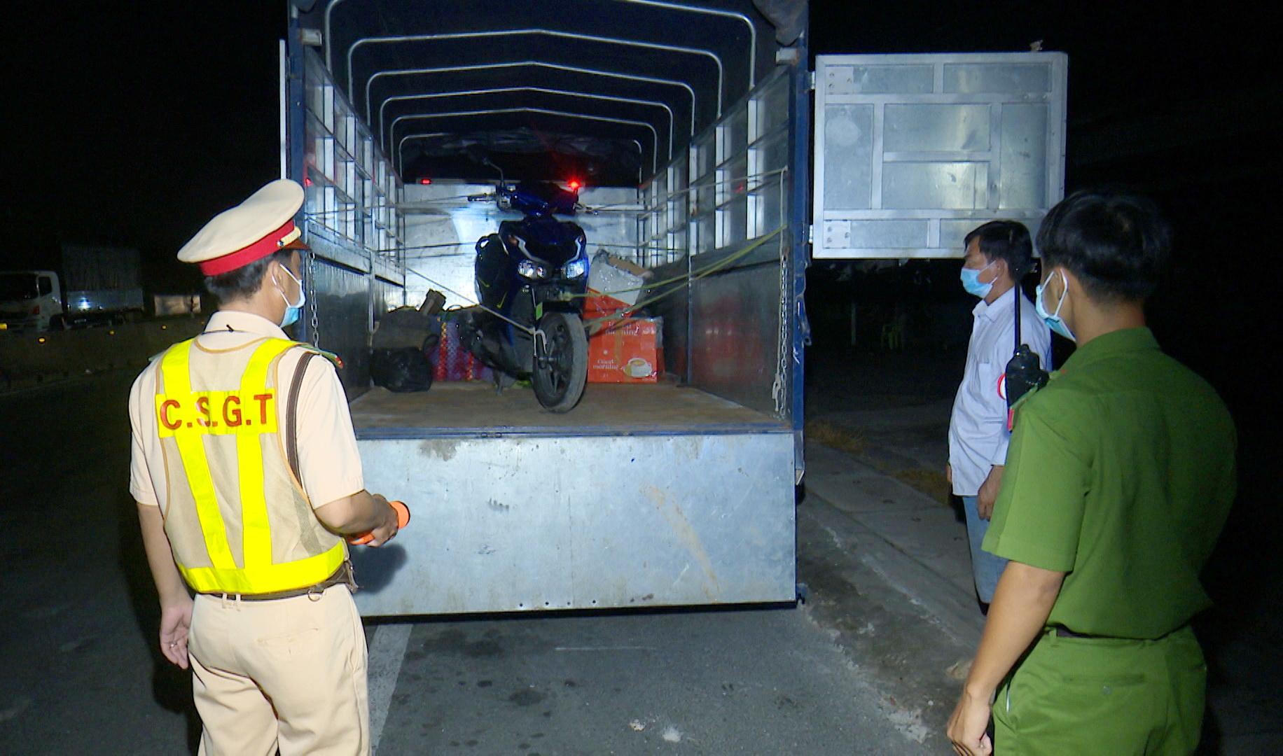 Lực lượng chức năng kiểm tra, phát hiện bên trong thùng xe tải có 1 xe máy có dấu hiệu nghi vấn. |