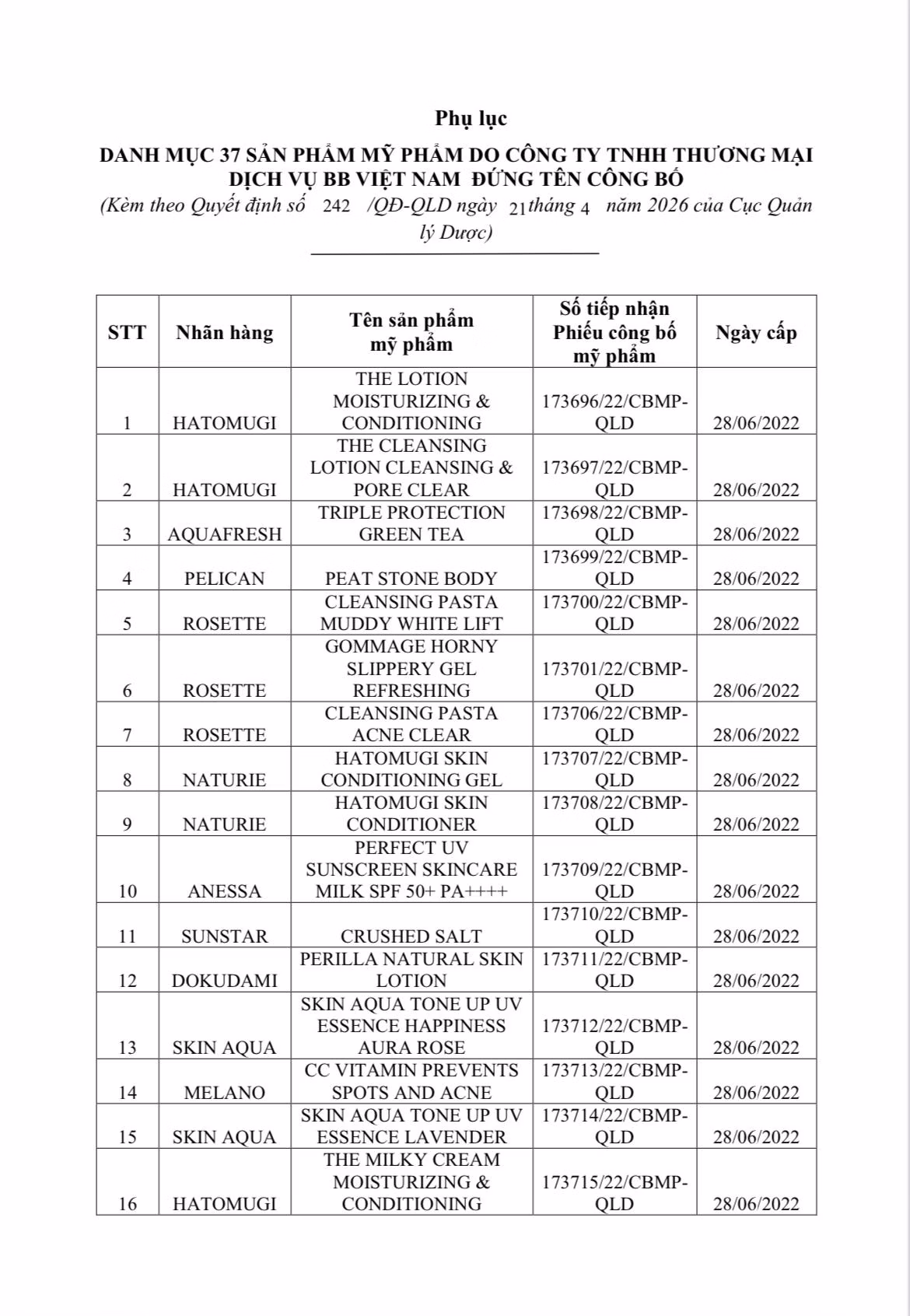 Cục Quản lý Dược (Bộ Y tế) quyết định phạt Công ty BB Việt Nam 75 triệu đồng, buộc công ty này thu hồi, tiêu hủy 37 mỹ phẩm vi phạm hồ sơ pháp lý, gồm các thương hiệu như Shiseido, Hada Labo, Anessa, Hatomugi, Senka...