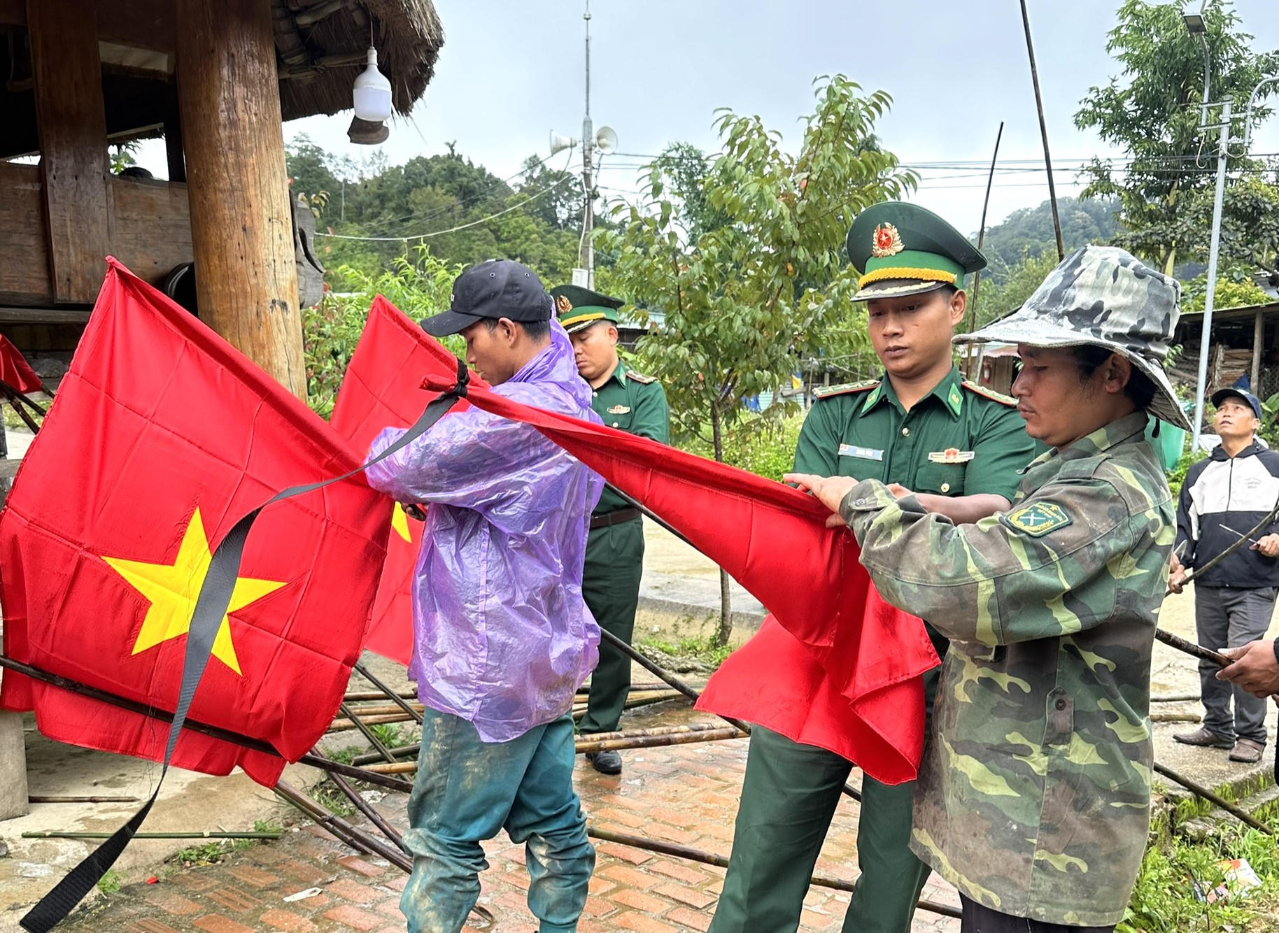 Bộ đội Biên phòng hướng dẫn người dân treo cờ rủ. |