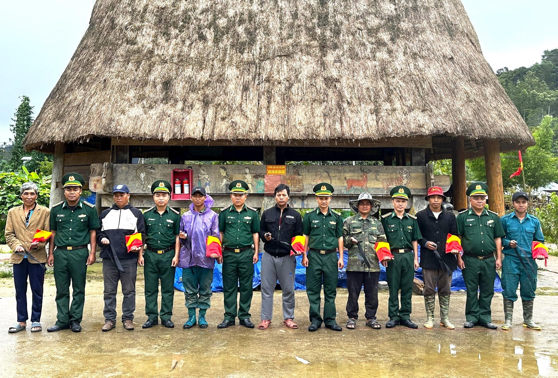 Những lá cờ Tổ quốc, cùng dải băng tang được cán bộ chiến sĩ phát cho nhân dân biên giới. |