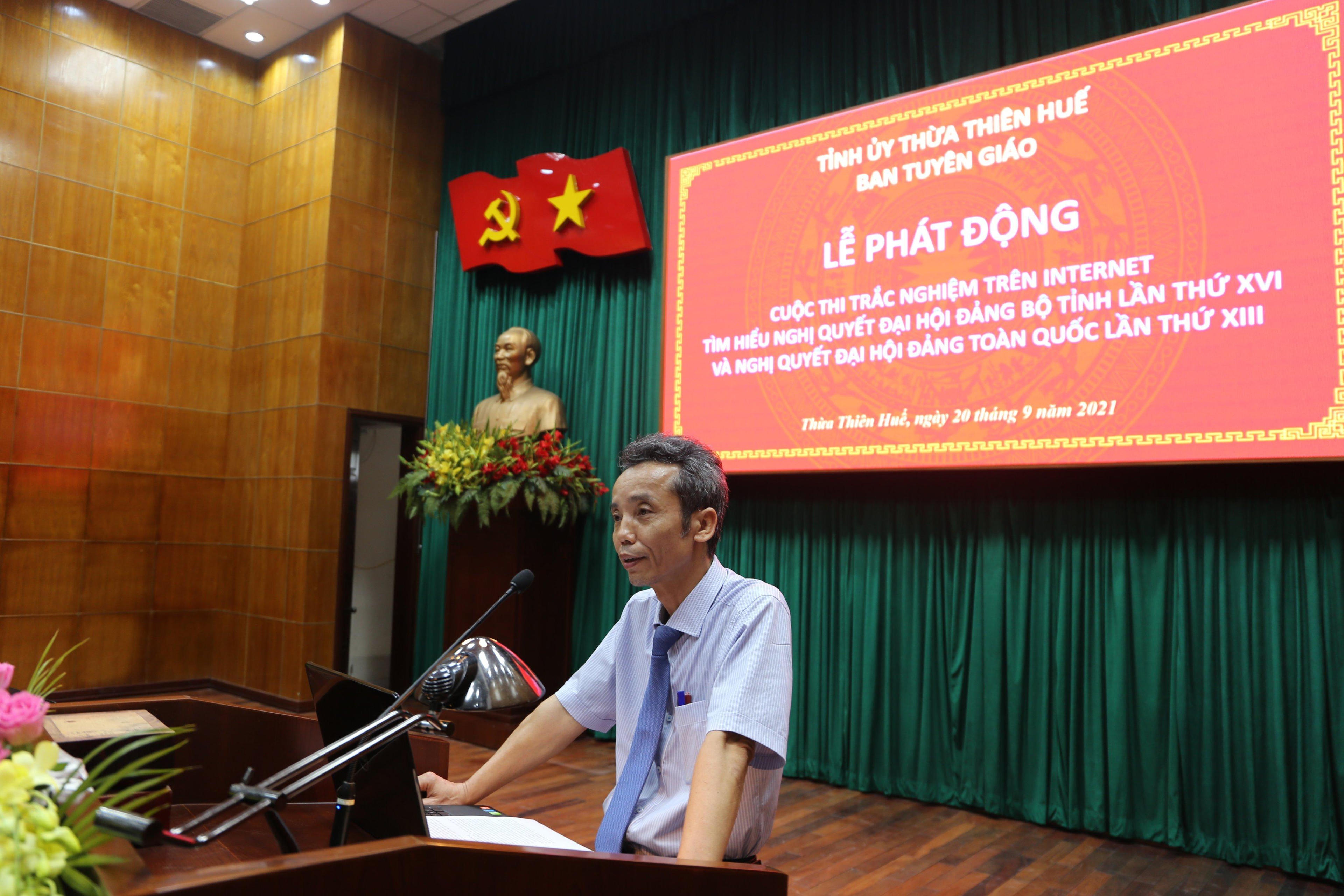 (PLVN) - Hôm nay (20/9/2021), Ban Tuyên giáo Tỉnh ủy Thừa Thiên Huế tổ chức phát động cuộc thi trắc nghiệm trên Internet “Tìm hiểu Nghị quyết Đại hội Đảng bộ tỉnh Thừa Thiên Huế lần thứ XVI và Nghị quyết Đại hội Đảng toàn quốc lần thứ XIII”.