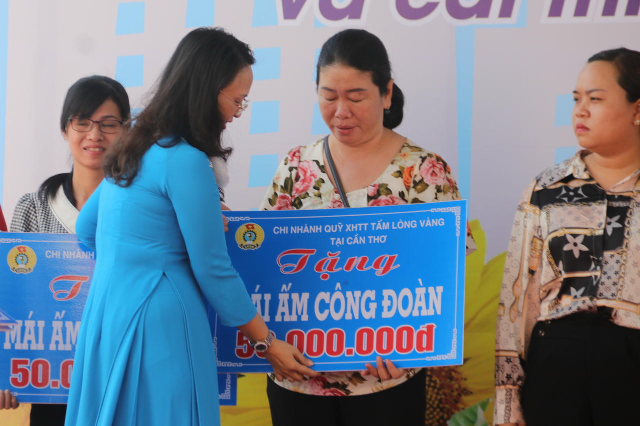 Bà Lê Thị Sương Mai – Chủ tịch Liên đoàn Lao động TP Cần Thơ trao tặng “Mái ấm công đoàn” cho các gia đình có hoàn cảnh khó khăn. |