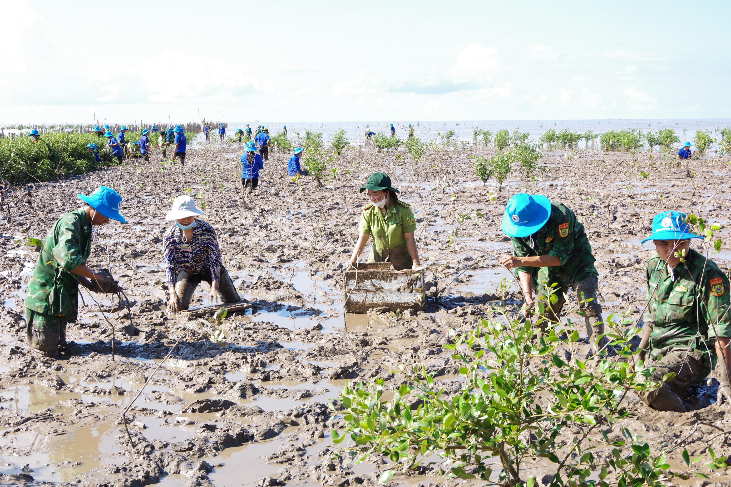 Sau lễ phát động, gần 200 đoàn viên thanh niên các đơn vị và người dân đã hăng hái tham gia trồng 2.000 cây mắm với diện tích trồng trên 1 ha đất bãi bồi ven biển tại khu vực khóm 6, phường 1 thị xã Vĩnh Châu.