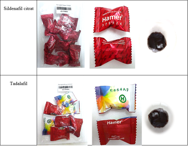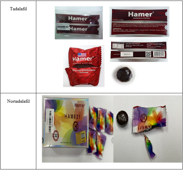 1 mẫu kẹo ngậm Kẹo ngậm Hamer 37F82K có chứa sildenafil citrat với hàm lượng từ 17,77 mg – 34,56 mg/1 viên và 01 mẫu kẹo ngậm Hamer 621 có chứa nortadalafil.