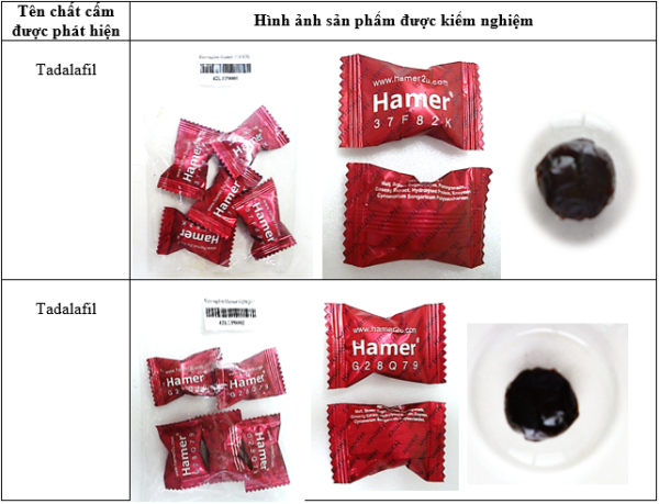 Kết quả kiểm nghiệm trong 6 sản phẩm kẹo ngậm Hamer được mua ngẫu nhiên tại một cửa hàng thuốc và sàn thương mại điện tử shopee, có 4 mẫu có chứa tadalafil với hàm lượng từ 92,63 mg – 266,94 mg/1 viên. Cụ thể, 4 mẫu gồm: Kẹo ngậm Hamer 37F82K ; Kẹo ngậm Hamer G28Q79; Kẹo ngậm Hamer E854A9; Kẹo ngậm Hamer GINSENG & COFFEE.