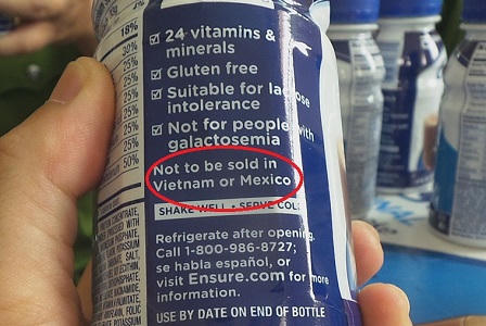 Riêng sản phẩm sữa nước Ensure, trên các chai đều được nhà sản xuất ghi rõ trên bao bì dòng chữ “Not to be sold in Vietnam and Mexico” (không bán tại Việt Nam và Mexico). Nhà sản xuất sẽ không chịu trách nhiệm về chất lượng khi tiêu thụ tại hai thị trường này.