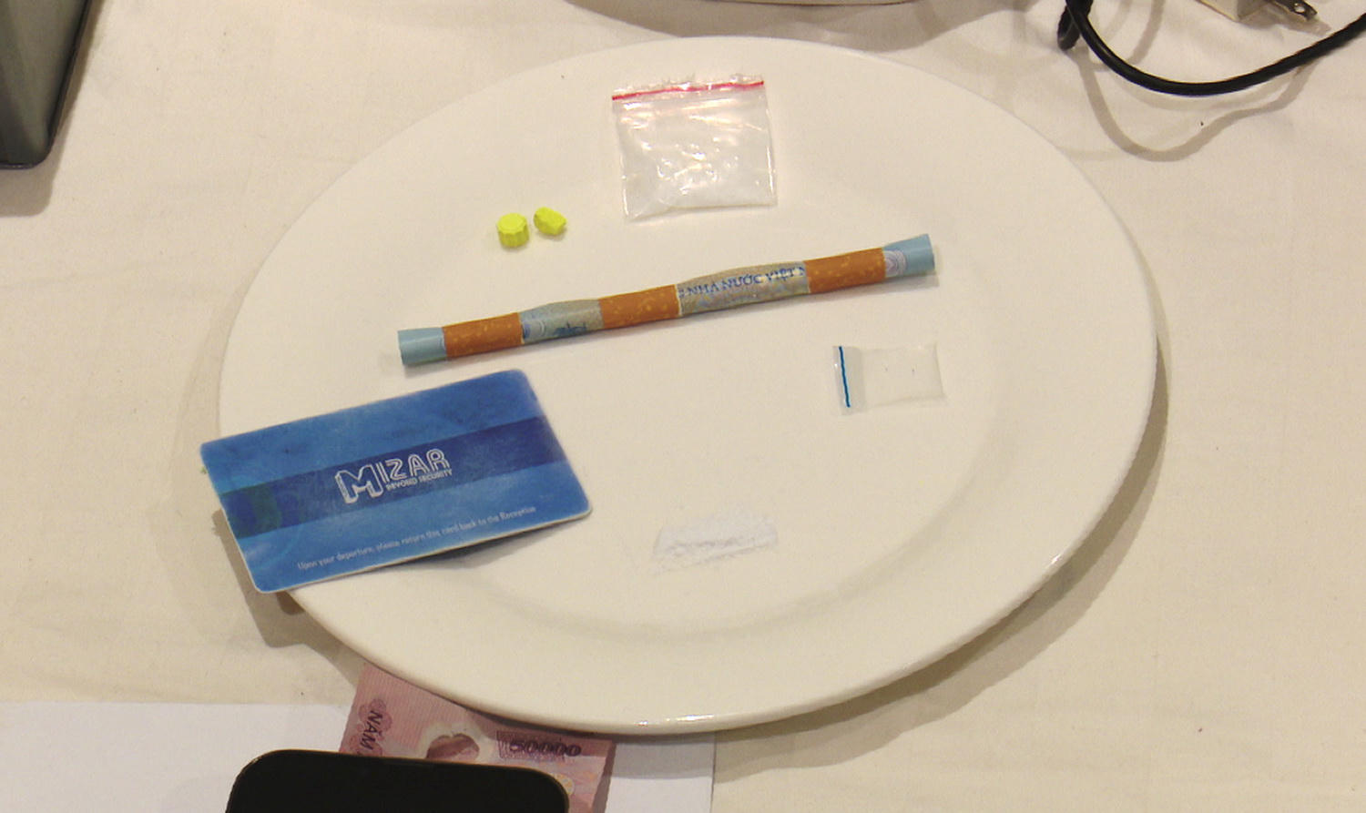 Tại hiện trường, lực lượng chức năng thu giữ: 2 viên nén màu xanh nghi là ma túy; 2 gói nylon bên trong có chứa các hạt tinh thể màu trắng nghi là ma túy; 5 điện thoại di động và một số tang vật khác có liên quan.