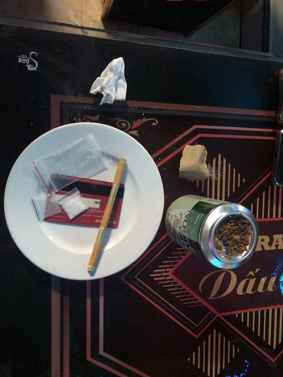Tại hiện trường, lực lượng thu giữ trên bàn 3 túi nilon, bên trong chứa chất bột màu trắng; 1 đĩa sứ bên trên có chứa chất bột màu trắng; 1 thẻ nhựa và 1 bật lửa.