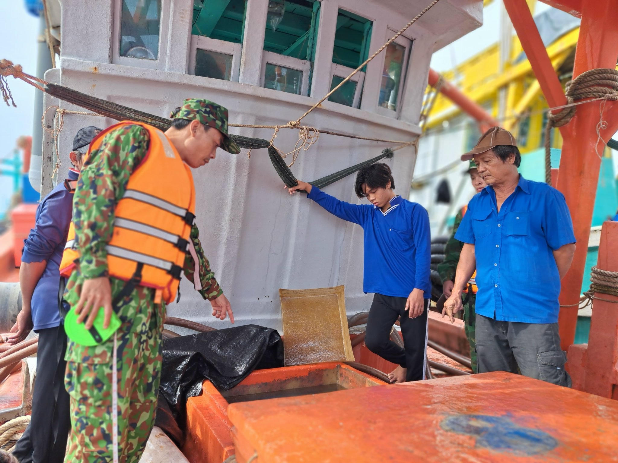 Khoảng 23h cùng ngày, cách mũi Hạnh, phường An Thới khoảng 15,4 hải lý về hướng Tây Nam thì đơn vị phát hiện cho dừng tàu kiểm tra tàu đánh cá mang biển hiệu KG 93262 TS do ông N.T.T (SN 1964, thường trú phường Vĩnh Thanh Vân, TP Rạch Giá, tỉnh Kiên Giang) làm thuyền trưởng. Qua kiểm tra, trên tàu có khoảng 50.000 lít dầu DO.