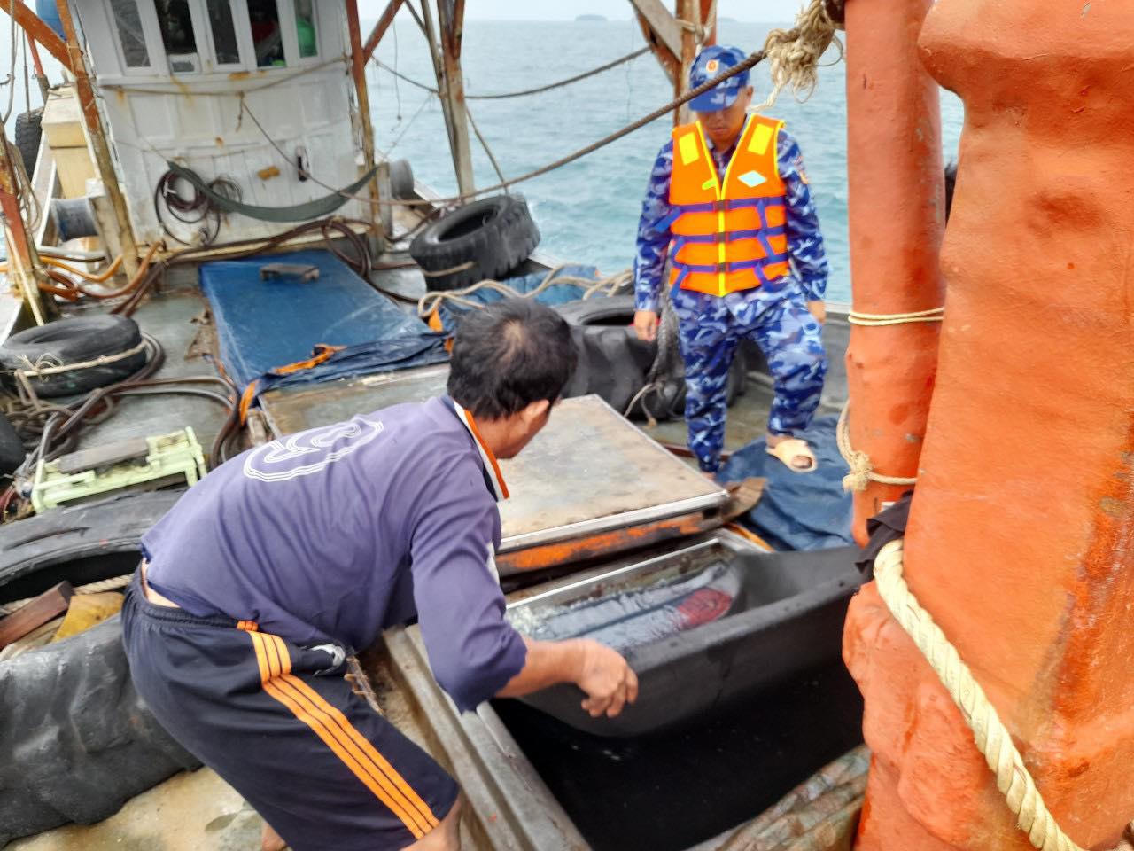 Cụ thể, vào lúc 01h20 ngày 19/2, tại khu vực biển cách Nam Tây Nam mũi Hòn Thơm (Phú Quốc, Kiên Giang) 17 hải lý, tổ công tác Đoàn Trinh sát số 2 đã phát hiện và kiểm tra tàu vỏ gỗ có số hiệu KG 95945 TS do ông N.M.T (SN 1982, trú tịa xã Mỹ Long, huyện Hòn Đất, Kiên Giang) làm thuyền trưởng.