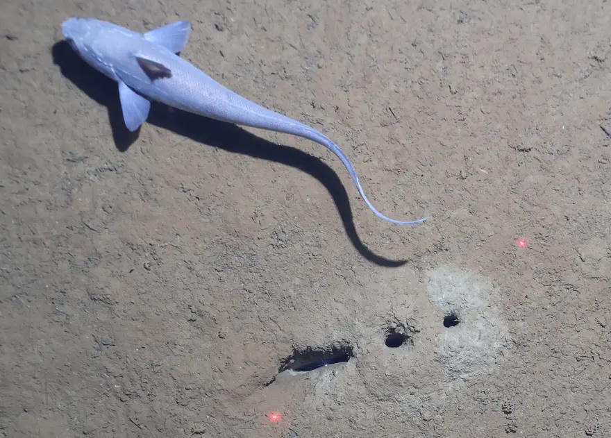Con cá grenadier bơi gần dãy lỗ dưới đáy biển. Ảnh: Thư viện trực tuyến Wiley. |