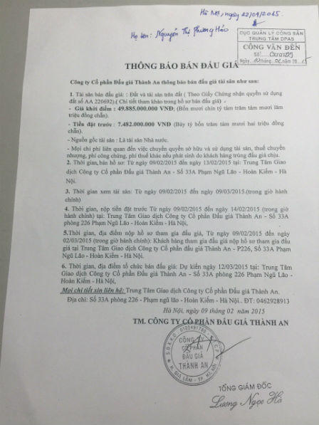 Cũng theo đại diện DPAS, Trang thông tin về TSNN đã đăng thông báo BĐG “cơ sở nhà đất theo Giấy chứng nhận quyền sử dụng đất số AA 220693” cho Cty Thành An vào ngày 31/3/2015 (cần phải nói thêm rằng, khi thực hiện loạt bài này, phóng viên phải rất mất công mới biết cơ sở nhà đất theo Giấy chứng nhận quyền sử dụng này chính là tòa nhà 164 Trần Quang Khải).