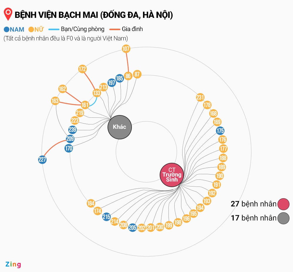 Nhóm thứ hai là những ca nhiễm chéo trong cộng đồng và ngoài xã hội, hiện nay có 17 ca. Nhóm thứ ba là các ca nhiễm trong Bệnh viện Bạch Mai với 36 ca.