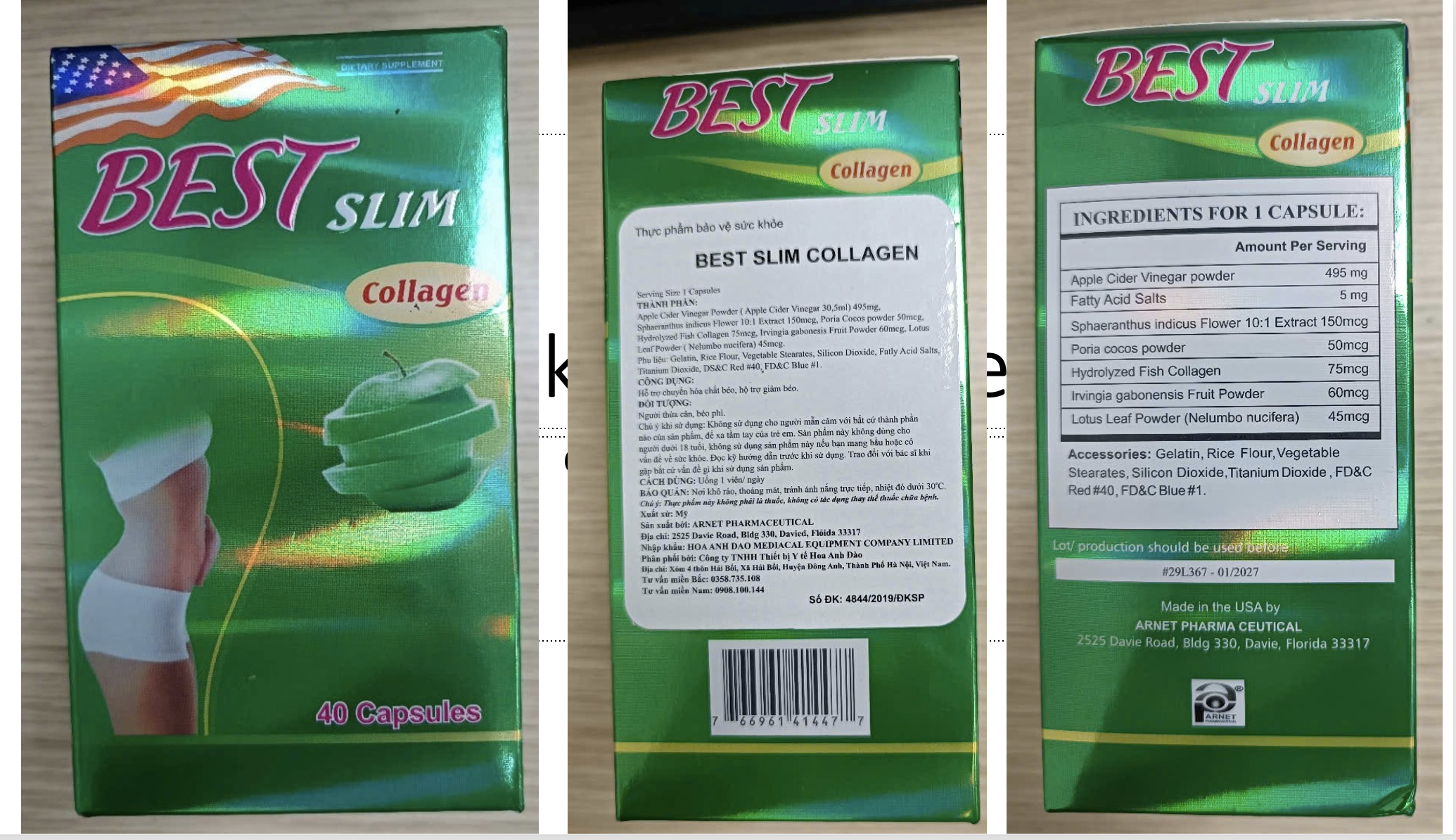 Thực phẩm bảo vệ sức khỏe Best Slim Collagen (Số lô 29L367, HSD: 01/2027). Thương nhân nhập khẩu, phân phối và chịu trách nhiệm về chất lượng hàng hóa là Công ty TNHH Thiết bị Y tế Hoa Anh Đào, địa chỉ tại xóm 4 Thôn Hải Bối, Xã Hải Bối, Huyện Đông Anh, TP Hà Nội. Sản phẩm xuất xứ từ Mỹ. Sản xuất bởi Arnet Pharmaceutical, 2525 Davie Road, Bldg 330. Davied, Florida 33317. Chất cấm phát hiện là Sibutramine.