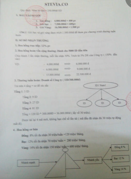 Tuy nhiên, để được “hưởng” số tiền có giá trị lớn như vậy, các nhà phân phối hoặc đại lý của Stevia VN phải thu hút, dụ dỗ được càng nhiều khách hàng tham gia vào mạng lưới kinh doanh đa cấp của mình và bán được nhiều hàng hoá, gói đầu tư.