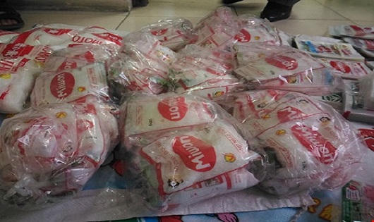 Qua khám xét nơi ở của bà Gắng, cơ quan Cảnh sát tiếp tục phát hiện và thu giữ hàng trăm gói bột màu trắng có ghi các nhãn hiệu AJINOMOTO hoặc MIWON và hàng chục bao tải cùng máy ép nhiệt, cân....