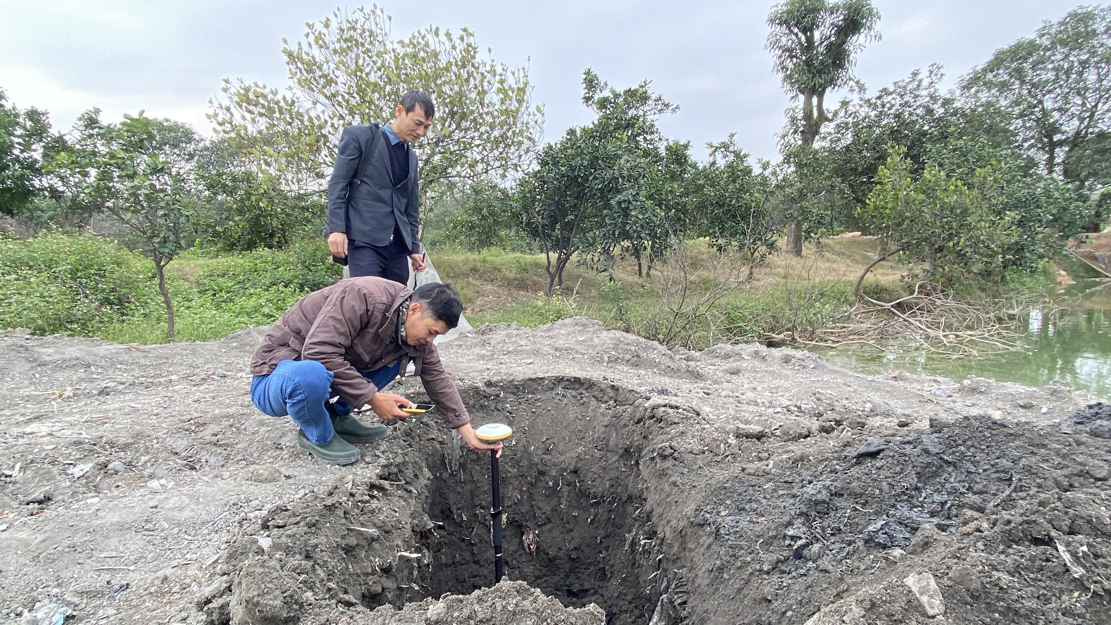 Theo quan sát, diện tích ao khoảng hơn 2.000 m2 nhưng hiện tại đã bị san lấp hết 2/3 ao, với độ sâu khoảng 2-3m. Đặc biệt, khi lực lượng chức năng tiến hành đào hố để lấy mẫu, có những khu vực sâu tới gần 4m, chất bùn khi được lấy lên làm kiểm nghiệm màu đen, bốc mùi hôi nồng nặc và rất dễ gây mệt mỏi khi tiếp xúc lâu.