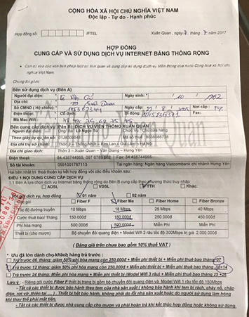 | Ảnh chụp bản hợp đồng từ đơn vị Viễn thông Xuân Quan sử dụng thương hiệu của FPT Telecom. Ảnh: FPT Telecom |