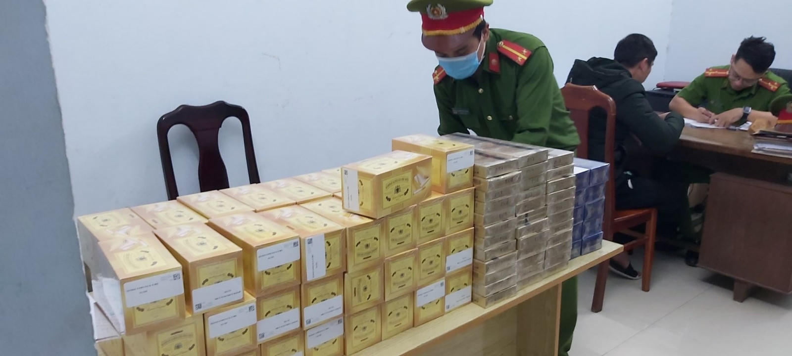 Qua kiểm tra, lực lượng Công an phát hiện 3 thùng hàng được đóng gói kĩ, khi mở ra bên trong đó có 950 bao thuốc lá ngoại nhập lậu của các hãng nước ngoài như George Karelias Aund Sons, ESSE GOLD, 555... được ngụy trang là thùng bánh kẹo.