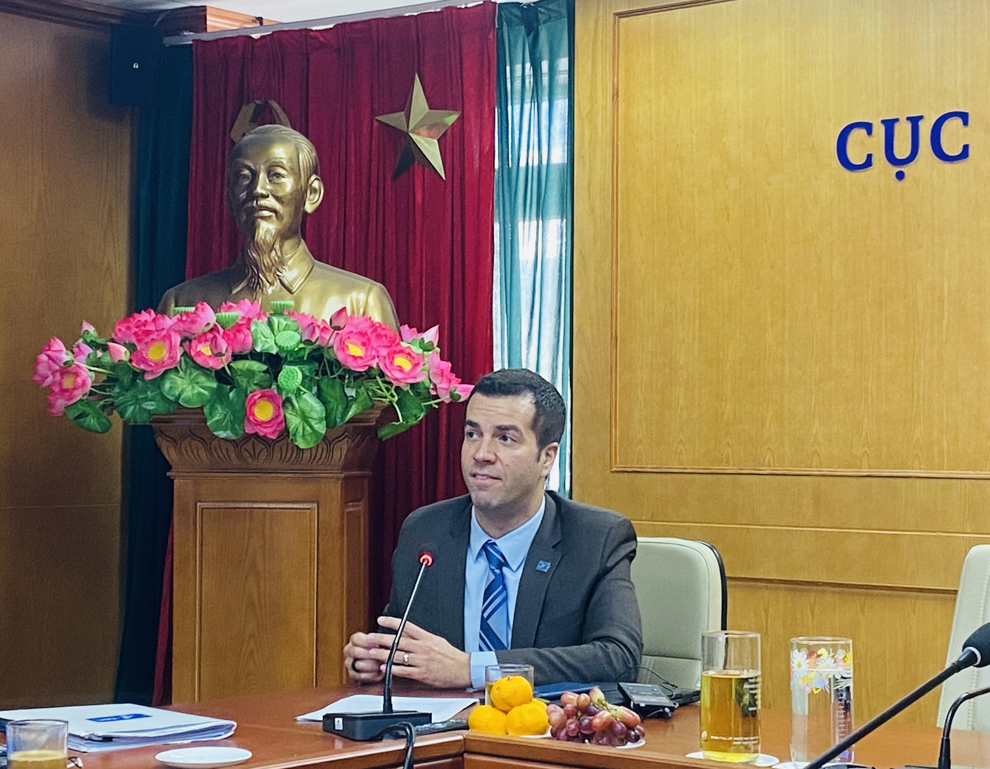 TS Eric Dzuiban, Giám đốc quốc gia, CDC Hoa Kỳ phát biểu tại buổi cung cấp thông tin với báo giới. Ảnh: Ngọc Nga |