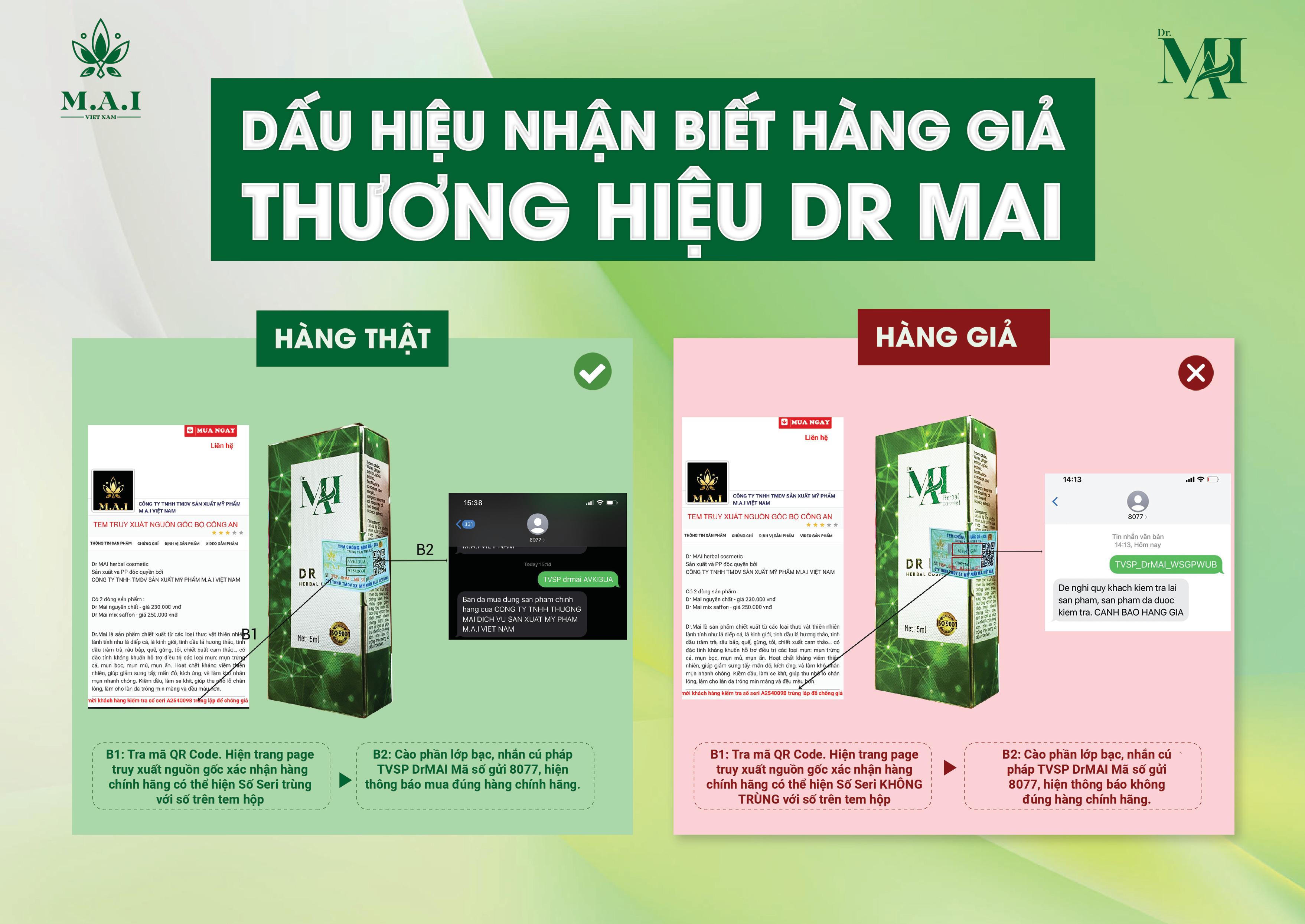 “Nếu người tiêu dùng không tinh ý sẽ rất dễ mua nhầm. Việc mua nhầm sản phẩm giả có thể gây ảnh hưởng làn da, sức khỏe của người tiêu dùng, ảnh hưởng đến uy tín và chất lượng sản phẩm của chúng tôi. Với sản phẩm của M.A.I Việt Nam luôn được in ấn kỹ lưỡng, và các dấu hiệu nhận biết riêng biệt đơn cử như hàng thật các mã vạch dưới đáy hộp sẽ không trùng nhau, trong khi đó hàng giả thì các dãy số đều trùng nhau.