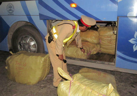Sau khi đón dừng kiểm tra, lực lượng CSGT đã phát hiện dưới gầm xe này có 5 thùng xốp đựng 250kg nội tạng trâu, bò đã bốc mùi thối và 9 bao tải chứa 160kg áo quần các loại, 550kg đế giày dép. Số hàng nói trên được cất giấu rất kỹ và được bao bọc kín bên ngoài bằng băng dán để ngụy trang, phía nhà xe không đưa ra được các giấy tờ chứng minh được nguồn gốc, xuất xứ hợp pháp.