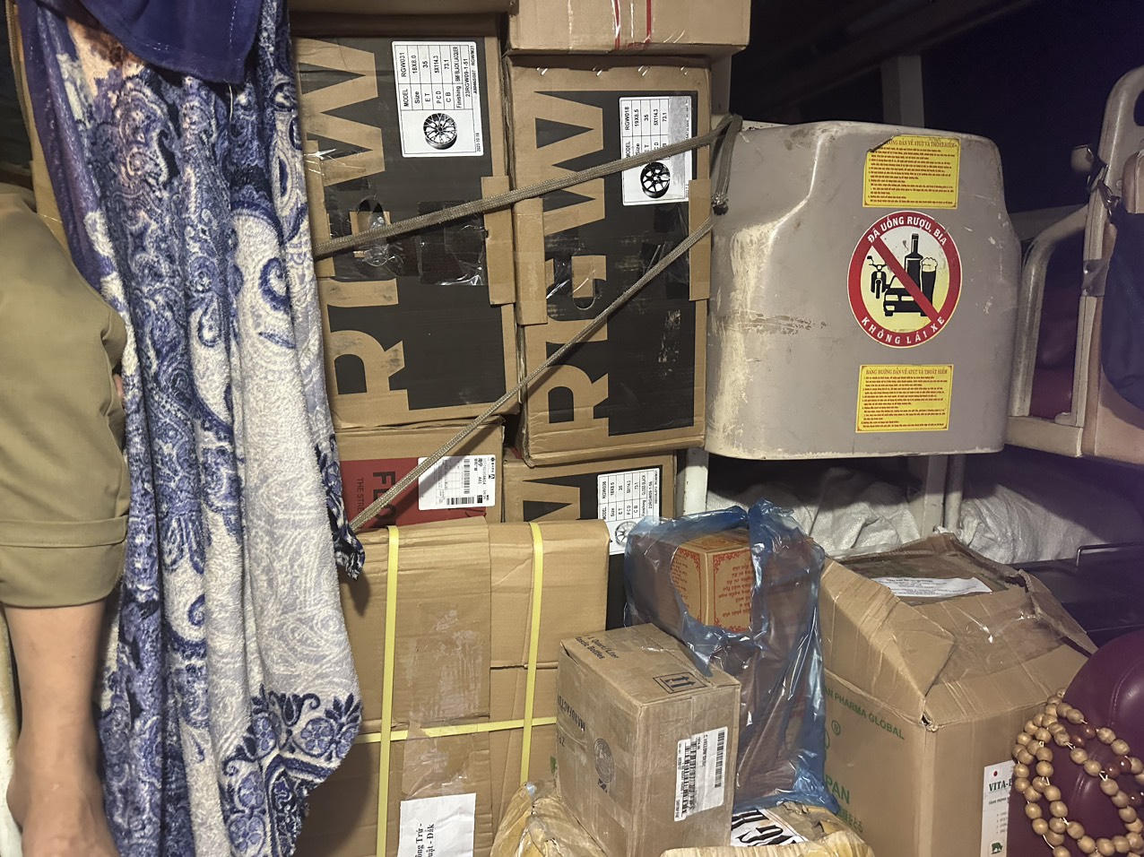 Qua khám phương tiện, lực lượng chức năng phát hiện xe khách nói trên không chở khách mà chở hàng hóa. Để qua mặt lực lượng chức năng, các ô kính trên thân xe được dán decal tối màu để che kín, phần lớn số giường nằm trên xe đã được tháo bỏ, thay vào đó là những bao/thùng hàng đủ loại từ mỹ phẩm, thực phẩm đến áo quần, váy vóc, phụ tùng ô tô các loại...