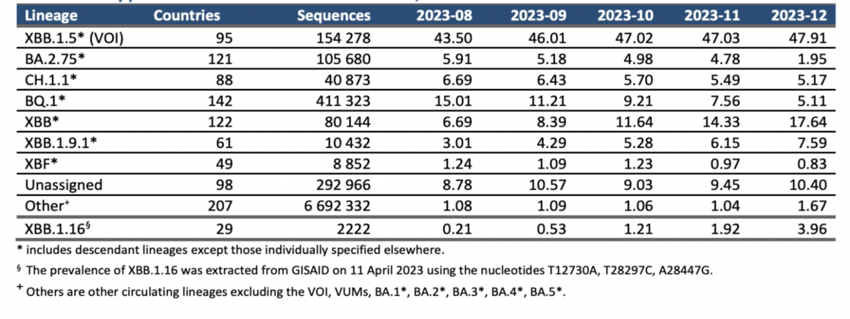 Điều đáng lo ngại là ngoài 1 biến thể phụ mới thuộc nhóm biến thể đáng quan tâm (XBB.1.5) đã xuất hiện tại 95 quốc gia, còn có thêm biến thể phụ XBB.1.16 vừa được WHO xếp vào nhóm biến thể cần được theo dõi, biến thể phụ này đã xuất hiện tại hơn 20 quốc gia và đang góp phần vào làn sóng ca mắc tăng cao ở Ấn Độ.