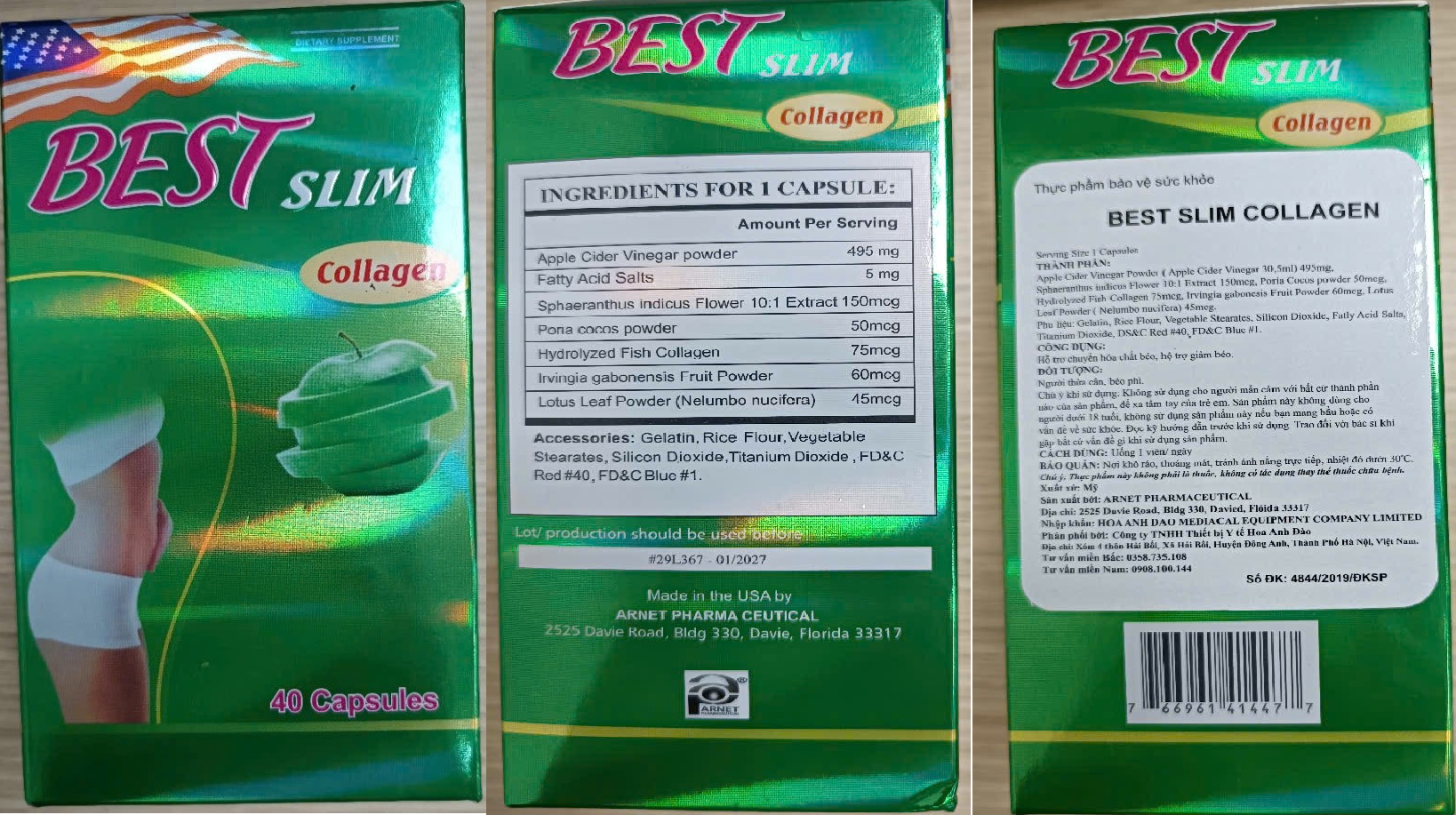 Cùng với đó, là Thực phẩm bảo vệ sức khỏe Best Slim Collagen (Số lô 29L367, HSD: 01/2027) do Công ty TNHH Thiết bị Y tế Hoa Anh Đào (địa chỉ: Xóm 4 Thôn Hải Bối, Xã Hải Bối, Huyện Đông Anh, TP. Hà Nội) là đơn vị nhập khẩu, phân phối và chịu trách nhiệm về chất lượng.